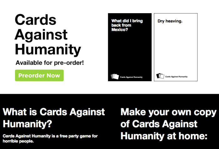 The cards are all black and white, but if you can convince them to use the color printer for no additional cost, you'll get a much nicer result. Cards against humanity is a casual party game, therefore there is no winning per se. You found the best deal at staples. You can play cards against humanity online on cardsagainsthumanity.com, owned and operated by cards against humanity, llc. Cut the cards up using one of those big slicers.